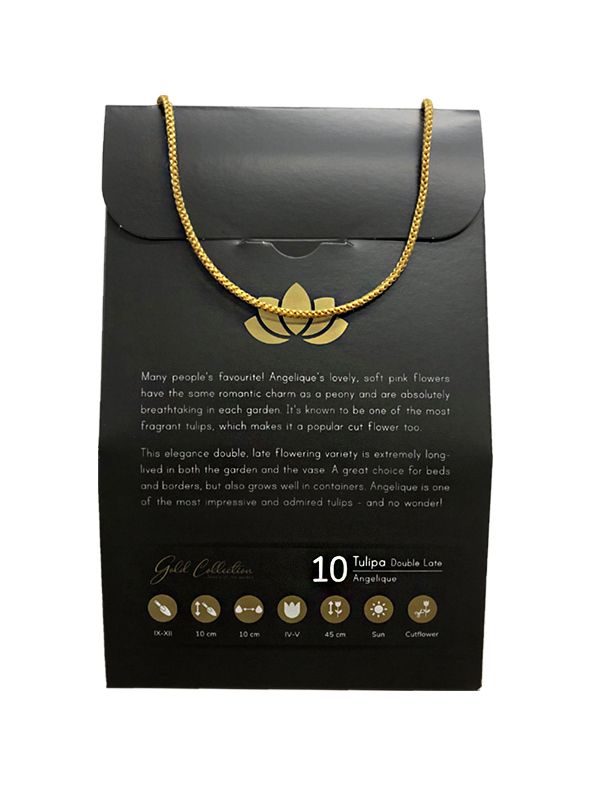 Luxus-Geschenkbox mit 10 Premium-Tulpenzwiebeln. Ideal als Geschäftspräsent oder als Geschenk für Freunde und Familie. Die Tulpe Angelique ist eine beliebte, sehr schöne und romantische doppelblütige Tulpe mit einer zartrosa Farbe.