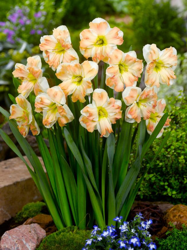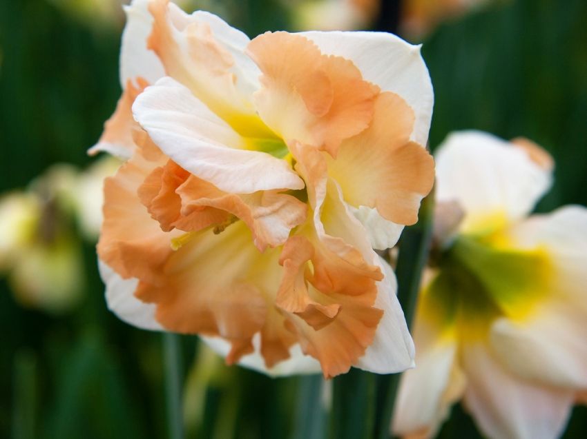 10 Punkte für diese auffällige Narzisse! Die anmutigen Blüten strahlen durch das pastellfarbene Aprikosenorange des Kronenblatts. Auch bekannnt als N. April Sunset. Narzissen aus der Split-Corona-Gruppe sind äusserst dekorativ, langblühend und gute Schnittblumen.