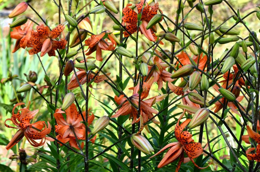 Lilium Flore Pleno ist eine neue Sorte der ursprünglichen Tigerlilie Tigrinium mit gefüllten orangefarbenen Blüten. Diese Lilie ist pollenfrei.