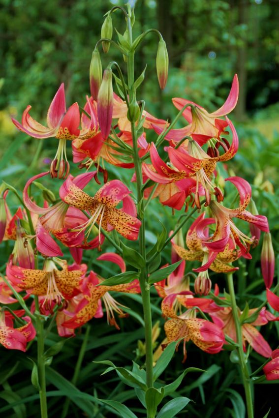 Lilium Fusion oder Tigerlilie ist eine schnell wachsende Sorte (Pardalinum X longiflorum) mit hängenden leuchtend roten Blüten und einem goldgelben Herzen, das lila-braun gesprenkelt ist. Sie lohnt sich und blüht in nahrhaften, durchlässigen Böden jedes Jahr problemlos von neuem.