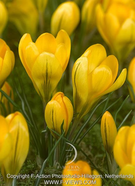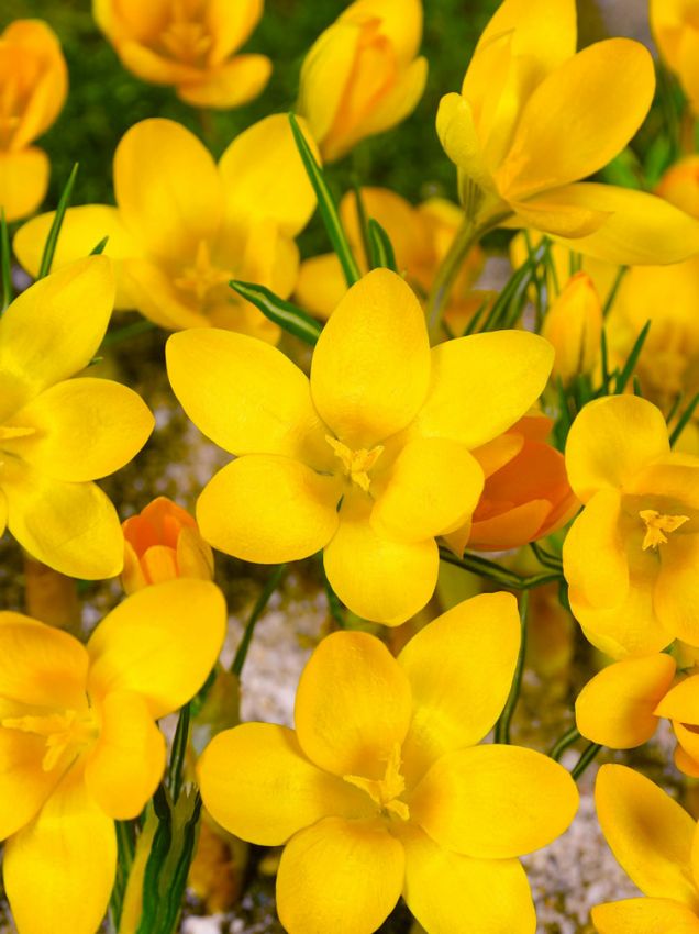Grosse goldgelbe Blüten. Grossblütige Krokusse (Vernus) blühen früh und jedes Jahr von neuem. Sie sind eine grossartige Quelle für Nektar und Pollen. Tipp: Pflanzen Sie sie in mehreren Gruppen von 10 oder 20 Zwiebeln für einen grossartigen Effekt.